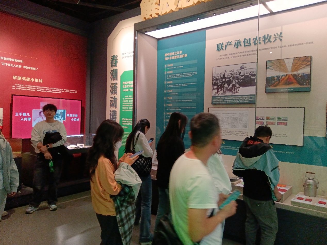本次“大思政课”实践研学活动中,师生们首先参观了“九原长歌”——包头古代史历史文化展厅,该展厅讲清楚了包头古代历史发展脉络和包头地区所发生或出现的重大历史事件和历史人物,全面梳理了包头作为民族交往交流交融前沿地带的独特区位优势,以及各个历史时期包头发挥的重要作用。在“西北巨埠”——包头近现代史展厅,讲述了包头从晚清到1949年的百年奋斗史,该展厅共包含三个单元,第一单元聚焦清代“走西口”对包头社会变迁的影响,第二单元展示中国共产党对包头社会变革的推动,第三单元展现包头地区的反帝反封建斗争。在“北疆明珠”展厅——包头当代史展厅,回眸了“齐心协力建包钢”的火红历史,展望新时代包头的辉煌前景,有助于更深刻地理解自然生态资源、劳动资料、劳动者、科学技术在人类经济社会发展中的重要作用。