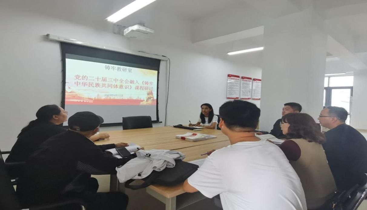 铸牢中华民族共同体意识教研室:老师们一致认为将党的二十届三中全会精神融入本课程的前提是老师自身需要认真学习领会会议精神,原原本本阅读全会通过的《决定》,在此基础上认真研究会议精神与教材内容契合的章节,深入讨论、研究融入的内容及方法,有计划、有目的地将党的二十届三中全会精神融入《铸牢中华民族共同体意识》课程。