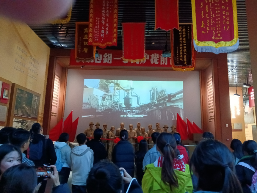 在包钢会展中心“齐心协力建包钢”主题展馆,讲解员讲述了包钢建设发展各个时期的历史场景,带领大家参观了包钢从上世纪五十年代建厂到今日现代化流水线的历史长廊,让大家深刻的感悟到在党中央号召下,全国支援和推动包钢从无到有,从小到大,从弱到强的沧桑巨变;通过一幅幅老照片、一件件珍贵文物、一段段影像资料,再现了老一代包钢人团结一心、无畏严寒、艰苦奋斗建设草原钢城的感人事迹,深切感受到包钢人为国家甘愿奉献的执着勇气与魄力。