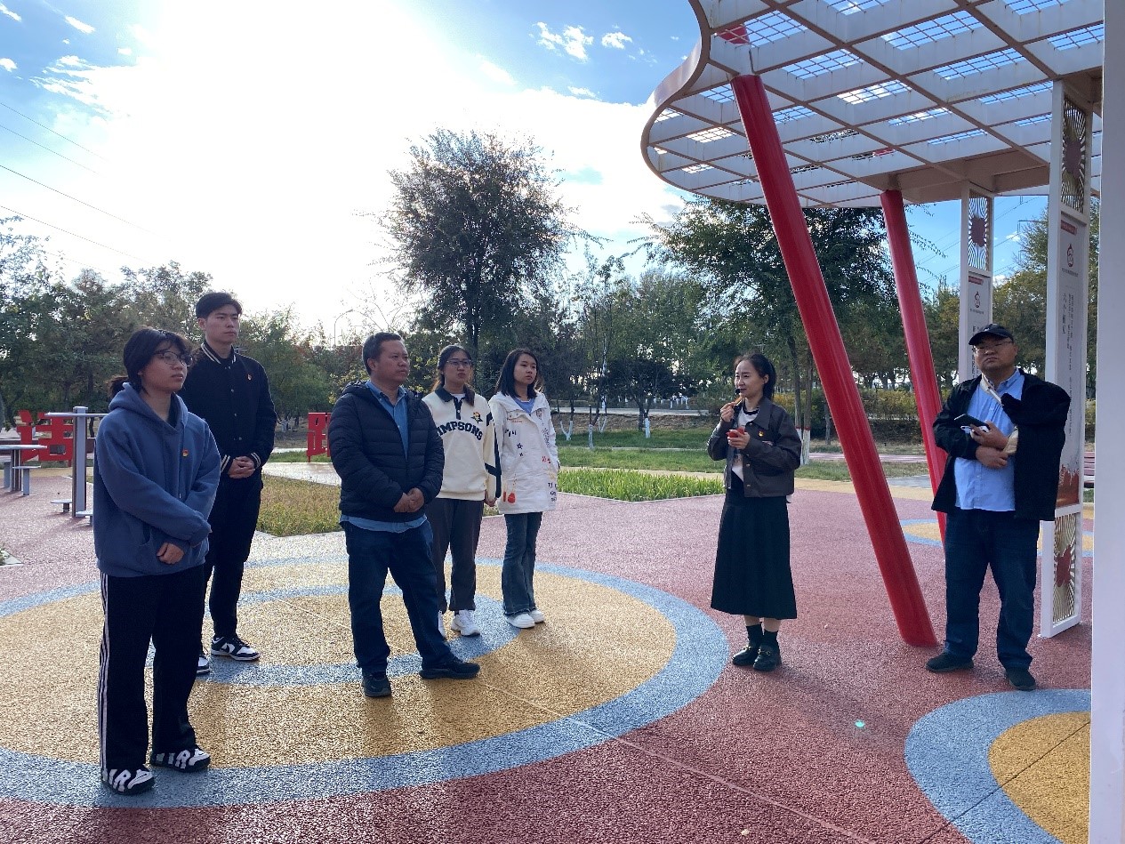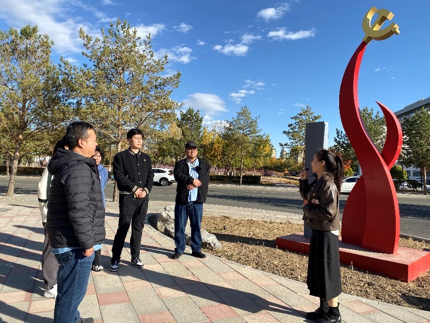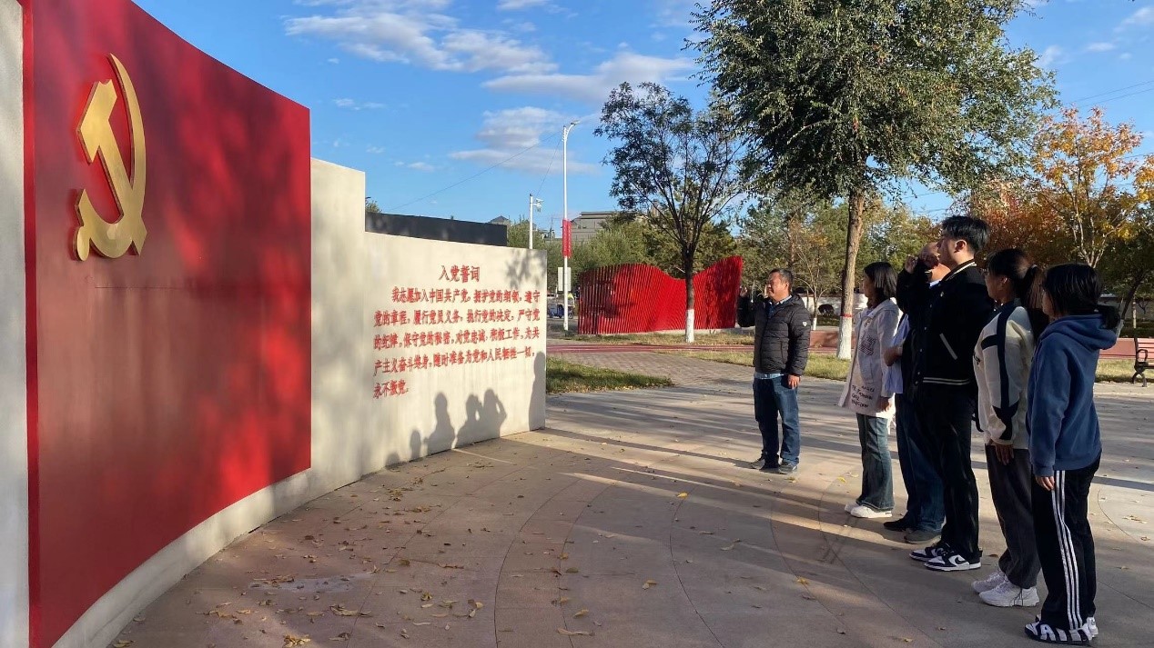 以“踔厉奋发,勇毅前行”屏风为起点,全体党员跟随讲解员的脚步沿着环形健步道开始了本次学习。在“红石榴籽凉亭”,讲解员为全体党员讲述了齐心协力建包钢、三千孤儿入内蒙等历史佳话,穿过“五星拱门”,全体党员在“初心广场”上面向党旗,重温入党誓词。