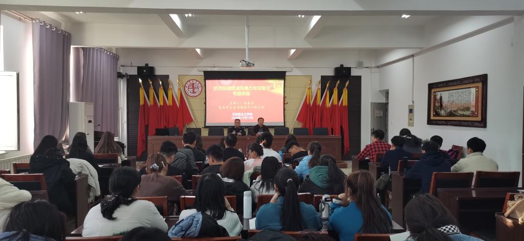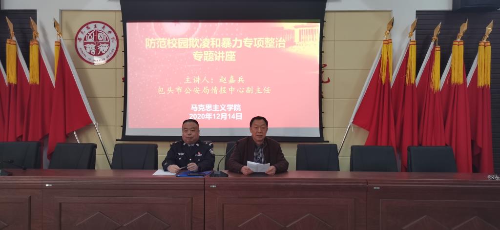 为进一步增强我院学生对校园欺凌和校园暴力的防范意识,更好地提高法制观念,12月14日下午4:00,英国365集团公司邀请包头市公安局情报中心副主任赵嘉兵警官、昆区公安分局政办室裴承君警官,在腾飞楼C509会议室开展了“防范校园欺凌和校园暴力专项整治”专题讲座。学院党总支副书记、副院长杨永旺主持讲座。