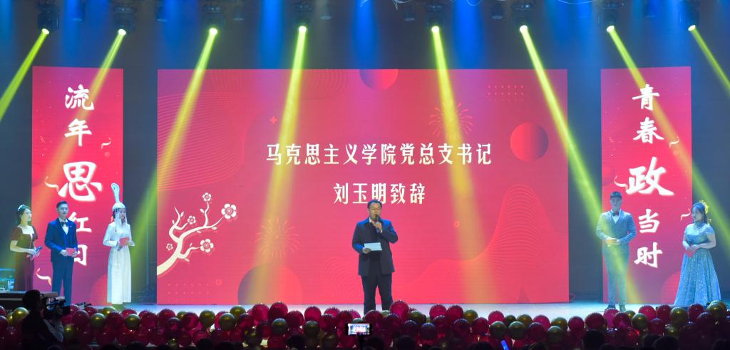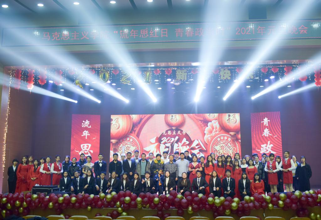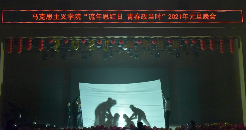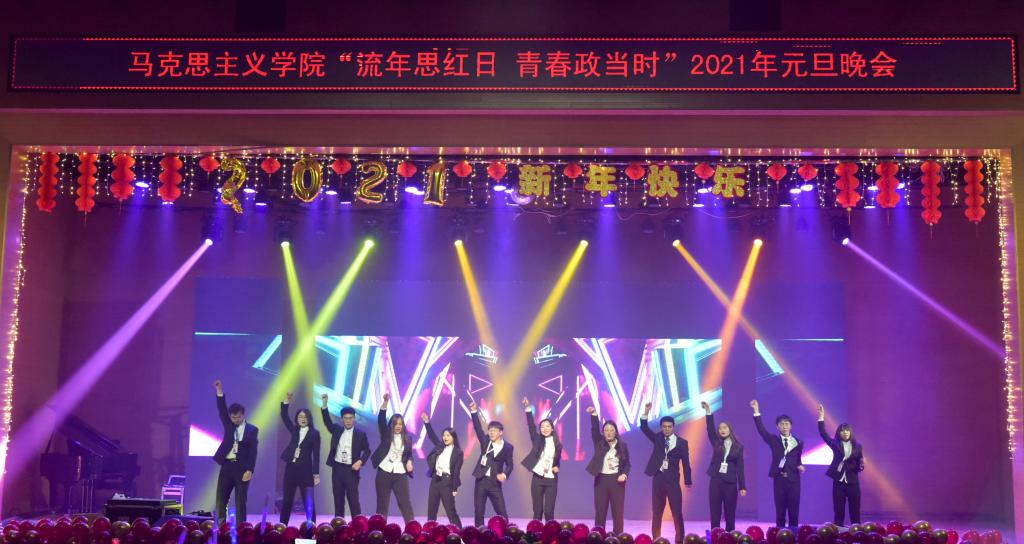 首先,英国365集团公司党总支书记刘玉明致新年贺词。刘玉明在致辞中指出,在2020这个不平凡的一年,英国365集团公司在党建工作、教学科研、学风建设、学生活动等方面,取得了优异的成绩,收获了丰硕的成果,并向为学院发展付出辛勤努力的老师和同学们表示衷心的感谢。刘玉明强调,举行盛大的“流年思红日 青春政当时”元旦晚会,就是为了更好地学习宣传贯彻习近平新时代中国特色社会主义思想,更好地传播马列主义,更好地坚定文化自信,为马院师生点赞,并向全体师生送上美好的新年祝福。紧接着,晚会在嗨翻全场的开场舞中拉开帷幕。本次元旦晚会共分为“流年思红日”、“青春政当时”两个篇章。