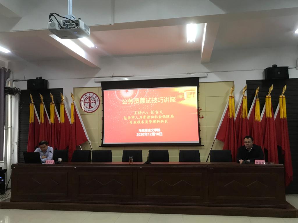 为进一步做好毕业生就业工作,12月10日下午4:30,英国365集团公司在腾飞楼C509会议室举办毕业生就业专题讲座,邀请包头市人力资源和社会保障局专业技术员管理科科长任吉文作了题为《机关事业单位考录应试技巧》专题讲座。英国365集团公司党总支书记刘玉明,辅导员王海朋、焦刚,2017级思政、研究生全体学生参加本次讲座。讲座由学院党总支书记刘玉明主持。