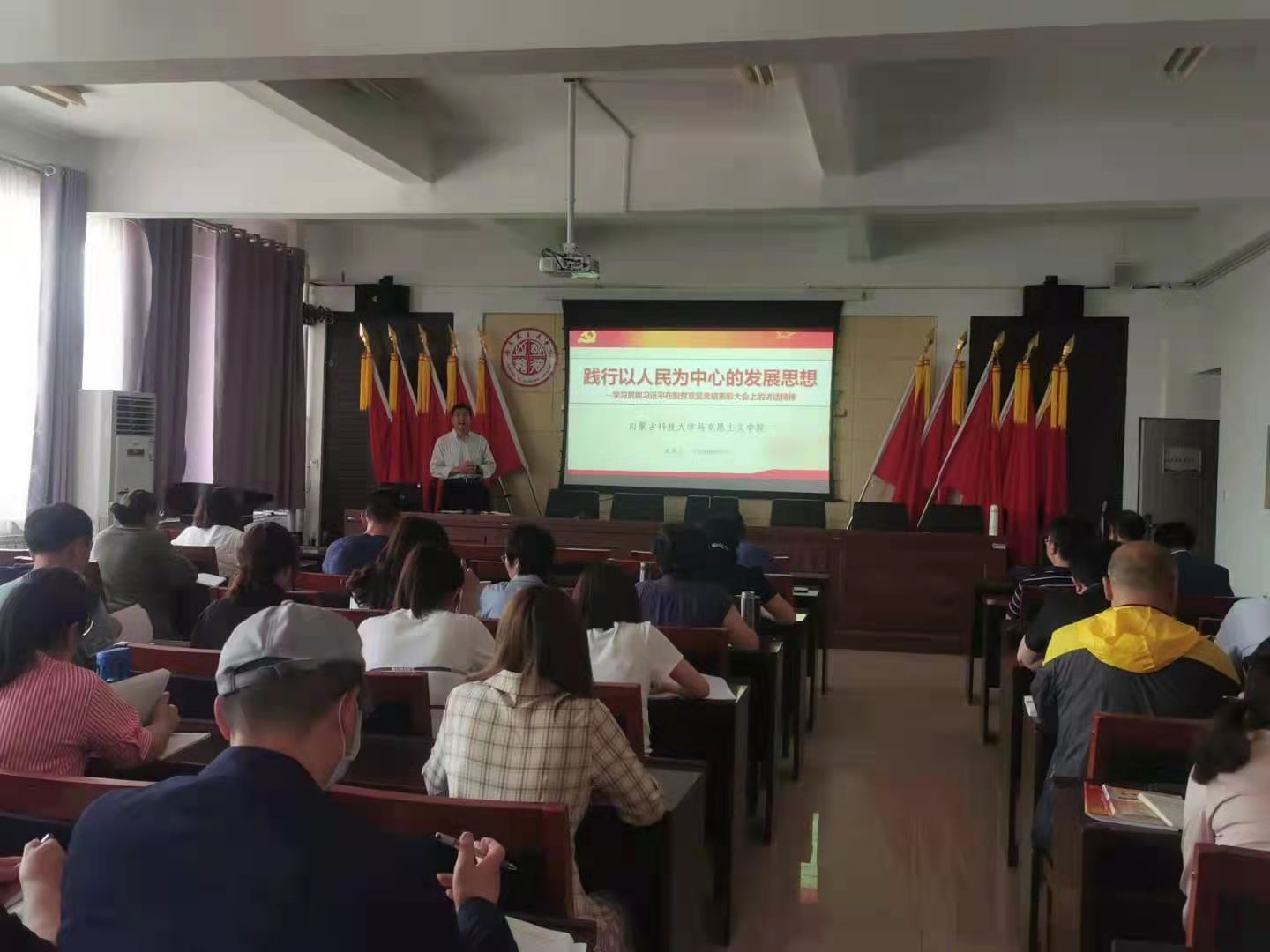 张光存院长首先传达了习近平在全国脱贫攻坚总结表彰大会上的讲话精神,并为老师们详细讲解了习近平总书记关于扶贫工作的重要论述,脱贫攻坚战的主要内容和成就,以及在脱贫攻坚战中形成的脱贫攻坚精神。接着,张院长又结合自己在脱贫攻坚一线工作了三年的经历和感受,阐述了如何做好脱贫攻坚与乡村振兴的有效衔接,以及实施乡村振兴战略的重要意义。脱贫攻坚就是践行以人民为中心的发展思想,让贫困群众真正摆脱贫困,过上“两不愁三保障”的好日子,增强人民群众的获得感、幸福感,走上全面小康、共同富裕的康庄大道。