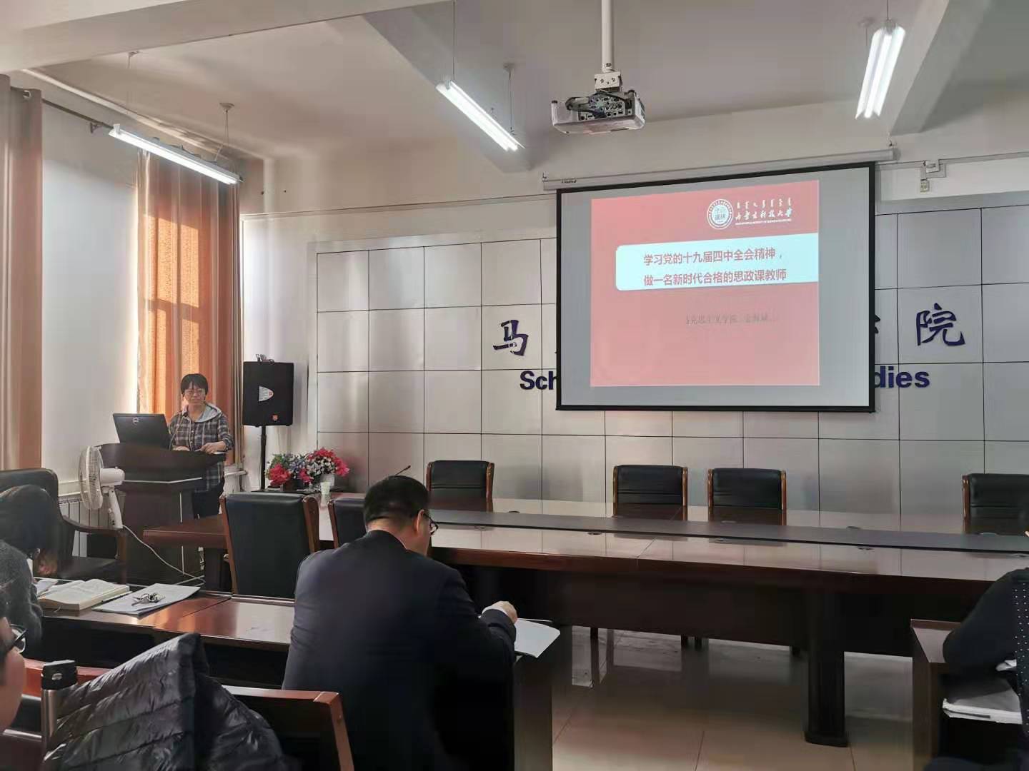 11月14日下午,教工党支部书记金海斌在腾飞楼C517会议室作了题为《学习党的十九届四中全会精神 做一名新时代合格的思政课教师》的专题党课。