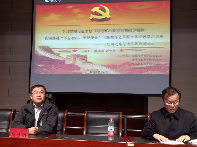 为深入学习贯彻落实习近平总书记考察内蒙古重要指示精神,扎实推进“不忘初心、牢记使命”主题教育,11月27日晚上19:00,英国365集团公司党总支和能源与环境学院、材料与冶金学院、文法学院等党总支联合在在图书馆B201报告厅举办“不忘初心、牢记使命”主题教育之草原文化专题学习讲座。邀请内蒙古社科院草原文化研究所研究员康建国作了题为《丝绸之路与北方民族历史》的专题讲座。学院党总支书记刘玉明,教工党员代表、研究生党支部及本科生党支部全体党员参加学习活动。